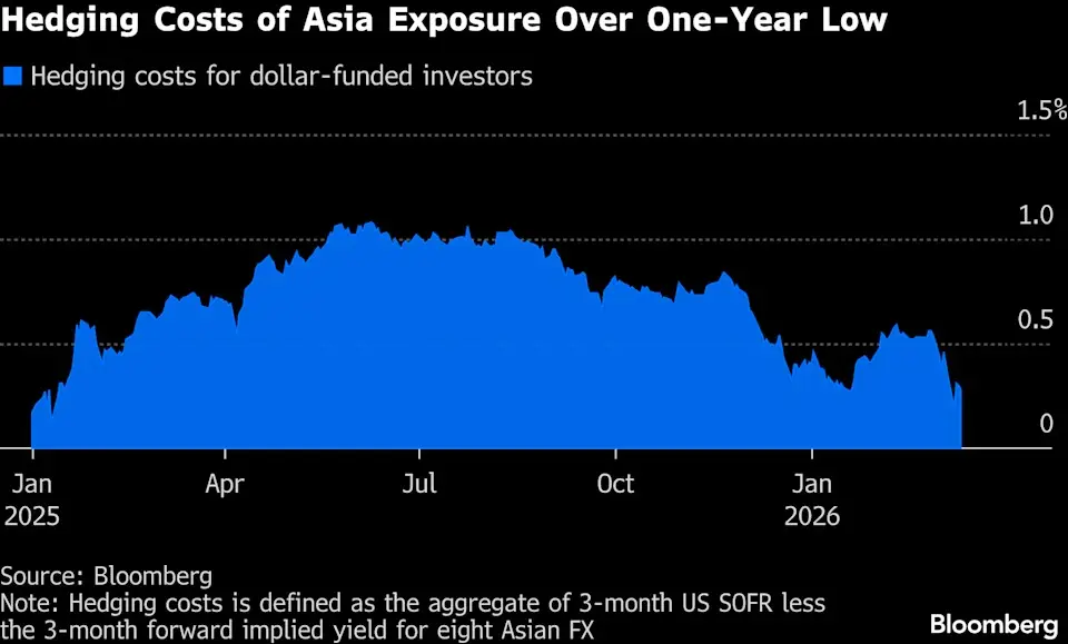 For dollar-funded investors, the costs of hedging currency risk have fallen to an average of 0.28% for eight major Asian currencies, the lowest in over a year, according to three-month forward implied yields compiled by Bloomberg.