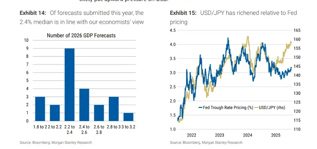 大摩对外汇市场的看法经历了修正。此前他们认为美国经济将在 2026 年初走弱从而拖累美元,但现在的经济数据显示美国增长强劲(2026 年 GDP 增速预期上调至 2.4%),且美联储降息时间推迟(从 1 月推迟至 6 月和 9 月)。