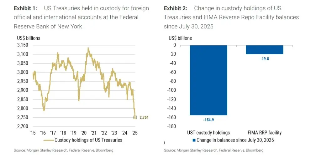 近期市场动态显示,外国官方机构的资产配置出现了显著变化。根据研报援引纽约联储的数据,从 2025 年 7 月 30 日至 10 月 22 日,外国官方及国际账户在纽约联储托管的美国国债规模下降了近 1550 亿美元。而这笔资金并未流入联储的外国和国际货币当局(FIMA)逆回购工具中。