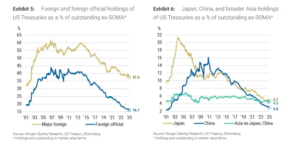 对于外国官方投资者减持美债的行为,摩根士丹利表现得并不担忧。报告指出,这实际上是一个持续了十多年的长期趋势。