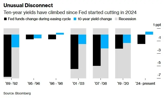 通常情况下,当美联储上调或下调短期政策利率时,长期债券收益率往往会随之变动。即使在过去四十年中仅有的两次非衰退期降息周期(1995 年和 1998 年,当时美联储每次各降息 75 个基点)中,10 年期美债收益率也要么下降,要么其涨幅远小于本轮降息周期。