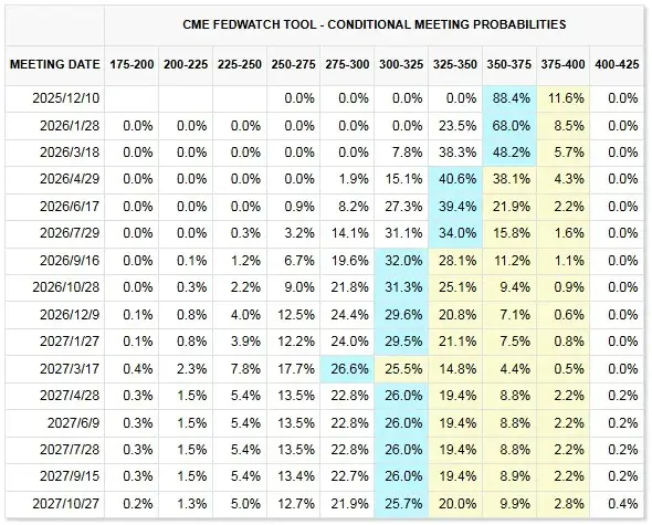 美联储自 2024 年 9 月开始将联邦基金利率从二十多年高位下调,迄今已累计降息 150 个基点,使其处于 3.75%-4%。交易员已完全定价美联储将在本周三再次降息 25 个基点,并普遍预计明年还将有两次各 25 个基点的降息,使该基准利率降至 3.00%-3.25%。